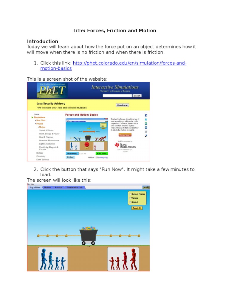 Http Www Prosper Isd Net Cms Lib5 Tx01918217 Centricity Domain 364 Physics 20force 20motion 20and 20acceleration 20phet Pdf from Forces and motion phet simulation lab answer keyrar view forces lab.pdf from physics 101 at logan university. 16.) any object's speed can be calculated by dividing the distance traveled by the time taken. Hetcoloradoedu en simulation this pdf book include answer key to phet labs information. Explore the forces at work when pulling against a cart,and pushing a refrigerator, crate, or person. Lab 5 forces and motion.docx. Open up simulation forces and motionlggigg the link in today's ipchart. Today's activity allows students to visualize motion and its correspondence to kinematics graphs while working with someone new. All answers will be recorded in your.